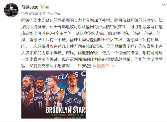 马健老师并没有点名勇士,但他强调“竞技赛场上有太多未知的因素不确定,伤病,体能的保证,包括一个位置的错位,都有可能是一场比赛胜负的关键。”19年的勇士和现在的篮网同样适用,那一年考辛斯、杜兰特、克莱相继倒下,甚至库里也是带伤作战,即使再强的队伍遇到这些问题都无法保证夺冠!现在的篮网杜兰特伤情到底如何?格里芬同样有旧伤隐患,欧文是否会继续作妖?这些问题也都是需要想到的!