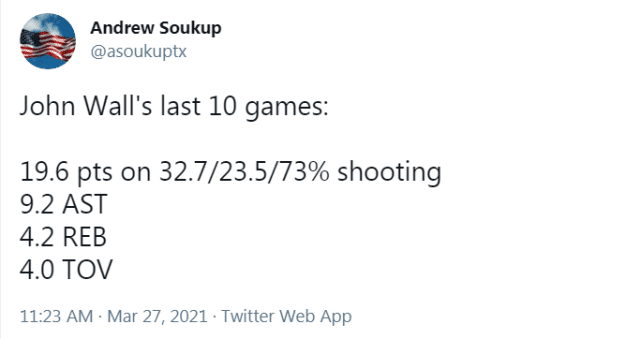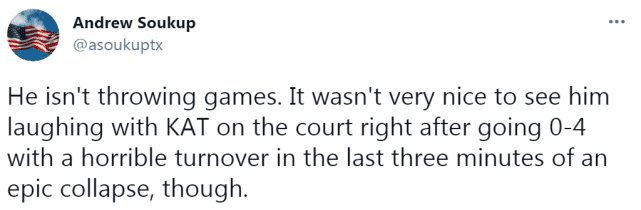 有球迷质疑沃尔是故意输球,但记者Andrew Soukup认为沃尔没有故意输球,可他也指出沃尔在最后3分钟4投0中且出现一次关键失误,火箭如此崩盘后,沃尔还和唐斯在赛后大笑,这样的场景令人不快。Andrew Soukup认为沃尔不是故意放水,而是本身状态就很糟糕。