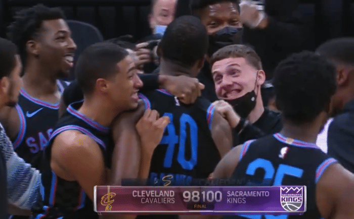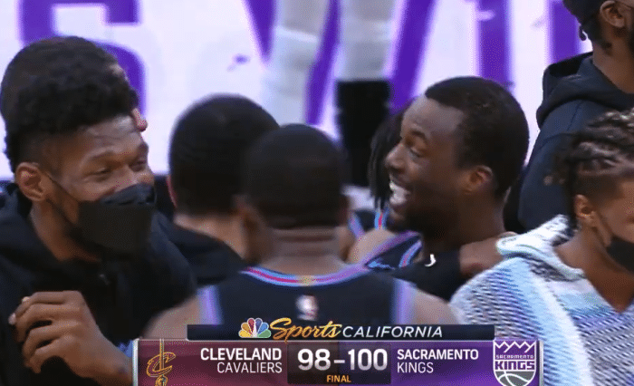 看到皮球进入篮筐,国王球员们疯狂冲向巴恩斯,很快将他团团围住。全队疯狂庆祝,就像是夺冠一样。的确,这样的场面,堪比夺冠。这球不免让人想起当年詹姆斯绝杀,也是后场罚球,詹姆斯也是前场接球,三分线外出手命中。但对于孱弱的国王来说,这样的场面并不多见。