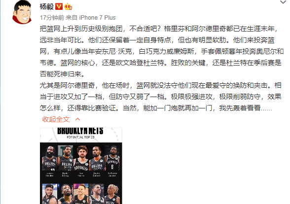 篮网七星阵是历史性抱团?杨毅反对:阿德和格里芬已到生涯末年