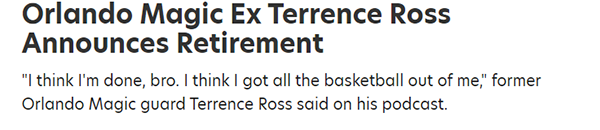 来源:24直播网12-02 13:2624直播网12月02日讯 ,32岁的特伦斯-罗斯正式宣布退役,在节目中表示:我认为我的篮球生涯已经结束了。我认为篮球对我来说已经是过去式了。
