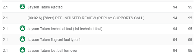 裁判回放这一幕后,裁判升级判罚,塔图姆吃到一级恶意犯规。