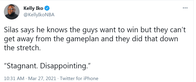 这样一场让人扎心的失利,自然也刺痛了菜鸟主帅赛拉斯。赛后,谈到最后时刻被森林狼22-0逆转,赛拉斯蹦出了两个词:“停滞不前,令人失望。(Stagnant. Disappointing.)”