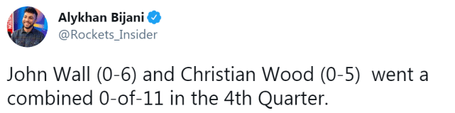 前三节表现还不错的伍德,在末节也屡投不中。火箭跟队记者给出伍德和沃尔的末节投篮分布图,沃尔6投0中,伍德5投0中,两人合计11投0中,火箭输球也就不足为奇了。