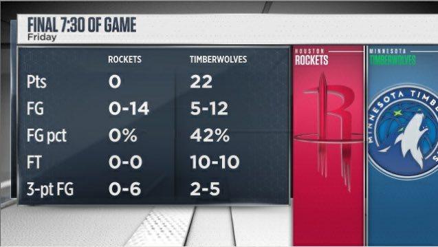 赛后,美媒第一时间给出最后7分30秒的双方数据。火箭14投0中,三分6投0中,没有得分,投篮命中率自然为零。森林狼12投5中,投篮命中率42%,罚球10罚10中,三分5投2中,最后7分30秒得到22分。