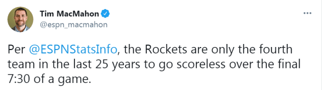 名记麦克马洪转发这一数据后表示,火箭成为过去25年来第4支在比赛最后7分30秒没有得分的球队,近况低迷的火箭又创下一项尴尬的纪录。