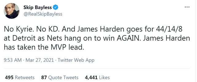 名嘴斯基普-贝勒斯在这场比赛结束后,也写道:“没有凯里,没有KD,詹姆斯-哈登在底特律拿下44+14+8的数据,篮网再次获胜。哈登已经领跑MVP争夺战。”