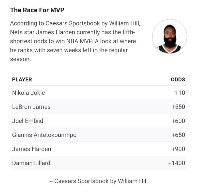 恩比德、詹姆斯都因为伤病缺席较长的时间,竞争MVP的希望不如以往,而相对出勤率很高的哈登,已经获得越来越多人的青睐。如今,包括哈登自己也相信有希望冲击MVP的荣誉。以目前MVP的最新赔率来看,领跑的依然是掘金的约基奇,他的赔率达到-110,随后是詹姆斯(+550)、恩比德(+600)、字母哥(+650)。哈登(+900)暂居第五,利拉德(+1400)排名第六。