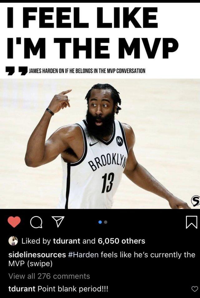 美媒指出,如果哈登拿到本赛季的常规赛MVP,他将创造一项历史,成为NBA首位在赛季中期被交易还能拿到MVP的球员。球迷发现杜兰特的哥哥也在哈登说自己是MVP的报道上点赞了。