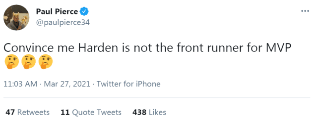 虽然仍有四位球员的赔率在哈登之前,但哈登的出色表现以及篮网的优秀战绩正在赢得更多记者的支持。MVP奖项是由记者投票产生,哈登的呼声已经越来越高。前NBA球星保罗-皮尔斯也在社媒上支持哈登,他写道:“说服我哈登不是MVP的领跑者。”