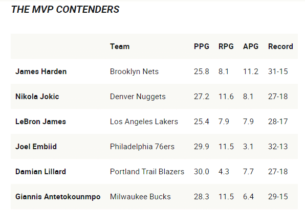美媒列出了哈登和这五位竞争对手的赛季数据以及战绩(如下图)。在这些球员效力的球队中,篮网目前的战绩仅次于费城,比掘金、湖人、开拓者和雄鹿都更出色。