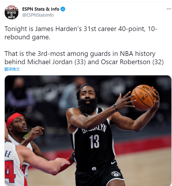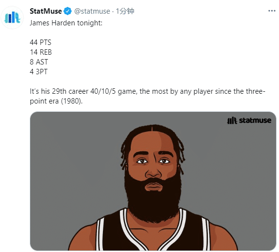 哈登44分创篮网生涯新高,又打出超级劲爆的一场比赛,还创神迹成NBA近41年第一人,据统计这是哈登职业生涯第29次单场40+10+5,这是1980年三分时代以来最多的;哈登生涯31次40+10比肩乔丹(33次)和大O罗伯特森(32次),成NBA历史第三后卫。