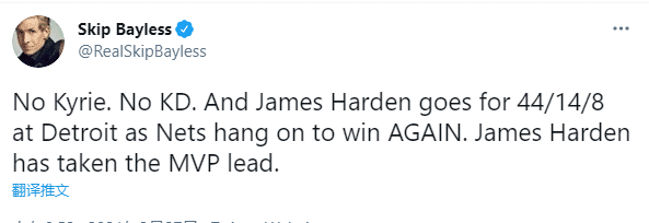 赛后美媒盛赞哈登MVP,露天看台则是调侃哈登是一个坏男人;著名詹黑斯基普-贝勒斯发推写道:没有杜兰特和欧文,哈登轰下44+14+8带队赢球,哈登已经是MVP了。
