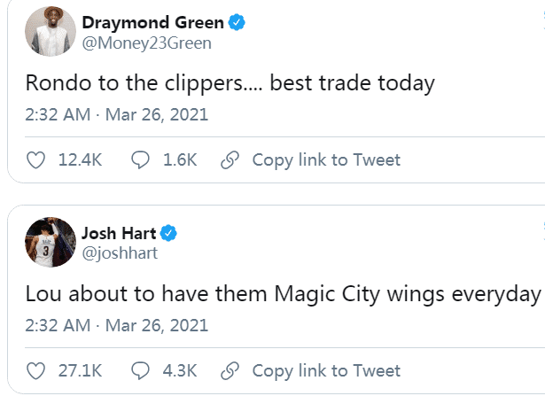 勇士球员格林点评道:“朗多加盟快船……是这一天最好的交易。”鹈鹕后卫约什-哈特调侃道:“路(威廉姆斯)现在可以每天吃到Magic City的鸡翅了。”