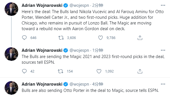 来源:24直播网03-26 12:0124直播网3月26日讯 重磅大交易来了,据ESPN名记报道,魔术把全明星中锋武切维奇和阿米奴交易到公牛,得到奥托·波特,小温德尔·卡特和两个首轮选秀权(2021和2023年首轮选秀权),魔术正式推倒重建,2换4正式交易全明星中锋,与此同时,魔术还交易富尼耶,戈登以及特伦斯-罗斯等主力也被摆上货架。