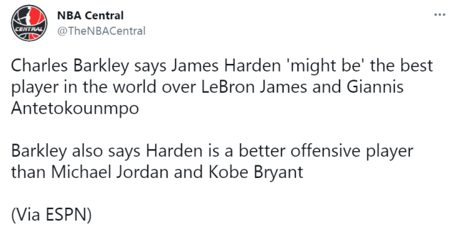 巴克利:哈登可能是世界上最强的球员!他的进攻比乔丹科比更出色