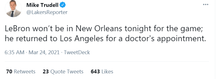 湖人跟队记者报道称,詹姆斯不会出现在新奥尔良,他已经返回洛杉矶和医生会面。