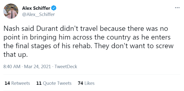 哈登带伤出战!杜兰特未随队前往客场,纳什:已进入康复最后阶段