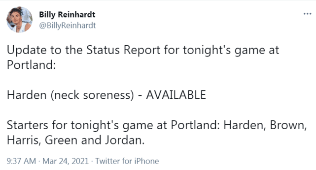 在这场比赛前,哈登脖子酸痛,被列为出战成疑(50%上场可能)。当时哈登表示自己被打到下巴后扭了脖子,但他认为问题不大,只需要一些治疗就能为下一场比赛做好准备。对开拓者一战前,他也来到场上热身,最终,他决定出战。