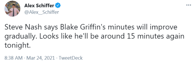 纳什表示,另一个伤员沙梅特可能会在底特律和球队会合,但目前没有确定。纳什还谈到了已经上演首秀的格里芬,他表示格里芬的上场时间会逐渐增加,而这场对开拓者,他预计还是让格里芬打15分钟左右的比赛。格里芬首秀得到2分2篮板1盖帽,并上演了一次双手暴扣。