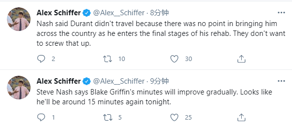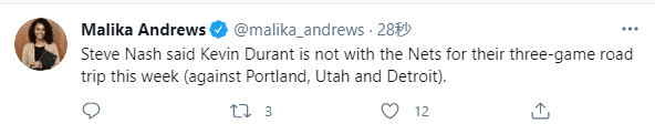 篮网三连客期间,担子又落在哈登的肩膀上,杜兰特和欧文全都缺席比赛,而且都暂时离开球队,他俩都不会坐在场边为队友加油打气;纳什表示杜兰特处于伤病康复的最后阶段,随队出战客场毫无意义,他们不想冒险把事情搞砸,目前杜兰特情况很好,没有具体复出时间表。