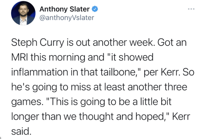 库里伤情更新!检测显示尾骨有炎症,将继续缺阵至少一周