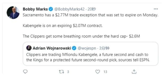 针对篮网队近期的补强,快船队也开始了自己的行动。近日,美国媒体爆出,快船队和国王队的3换1交易即将达成。这笔交易的内容是什么呢?按照原本的计划,快船队这边送出球员卡本盖莱、一个二轮秀以及部分现金,他们可以从国王队那里得到一个受到严格保护的二轮签。不过在随后的跟进报道中,爆料记者表示因为这个选秀权受到严格保护,国王队很有可能使用一个价值260万美元即将到期的交易特例,如果筹码真的是如此的话,那也意味着快船队用了球员+选秀签+现金为筹码换来的竟然是空气。