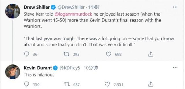 他的话意有所指,可能是想表明19年勇士未能夺冠是因为队内发生了很多并不好的事情,除了伤病之外还存在着各种矛盾没有被媒体曝光!看到科尔的这番言论,昔日勇士功臣杜兰特立刻回应“这真搞笑”昔日师徒到底发生了什么,或者说当年勇士内部到底发生了啥?