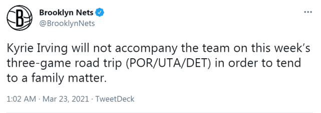 篮网官宣!欧文因处理家事缺席三连客,球迷:希望不是为了过生日
