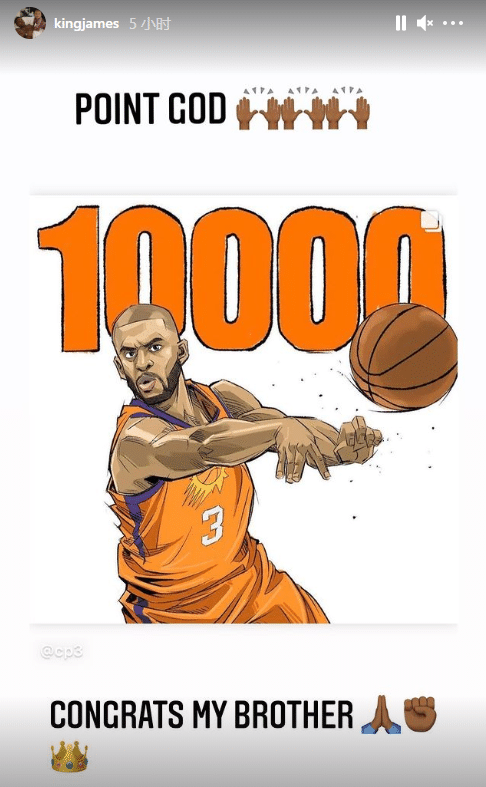 36岁詹姆斯也恭喜保罗助攻破万,转发保罗传球的漫画,并且写道:恭喜我的兄弟,控卫之神(双手赞同)。