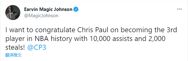 不久前,魔术师约翰逊发推写道:我想星系克里斯-保罗成为NBA历史第三位达成10000助攻+2000抢断的球员;35岁保罗常规赛助攻数已经突破10000次大关,历史第六位助攻破万的球员,也是现役第一人。