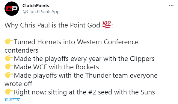 为何保罗配得上控卫之神的称号?美媒Clutch Points解释:把黄蜂(现在改名为鹈鹕)变成西部有力争夺者,每一年都带领快船杀进季后赛,带领火箭杀进西决,带领雷霆拒绝摆烂并杀进季后赛,现在带领太阳排名西部第二位。