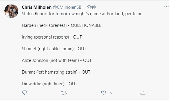 欧文因处理家庭事务而暂时离开球队,不会随队出征三连客,目前没人知道欧文请假离队的真正原因;哈登是在上一场对阵奇才比赛中,抢球时被马修斯撞伤脖子,虽然哈登拒绝轮休,表示很有信心治疗之后,他会带伤对阵开拓者,但篮网还是保持谨慎,把哈登放在伤病名单上。
