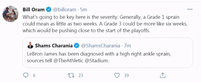 湖人记者转发了查拉尼亚的报道,指出詹姆斯伤停的时间要根据受伤的情况而定。如果是一级扭伤,预计伤停时间是两周左右,如果是3级扭伤,就要缺席大概6周时间,那很可能就要休战到接近季后赛开战。