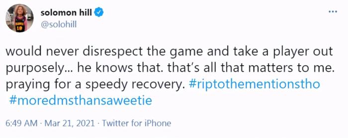 希尔本人也回应道:“不会不尊重比赛,并且故意让其他球员出局,他(詹姆斯)也明白这点。这对我来说是最重要的。祈祷他尽快康复。”