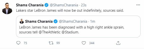 果不其然,虽然詹姆斯坚持回到场上,甚至还命中了一个三分球,可是他扛不住了,随后詹姆斯返回更衣室治疗,再也没有回到球场,很快名记SHAMS也更新了詹姆斯的伤情,老詹遭遇了右脚高位踝关节扭伤,将无限期休赛。随后,《洛杉矶时报》跟进报道称:詹姆斯的伤病至少要缺阵6-8周,不过詹姆斯不是正常人,或许会提前。