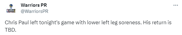 与国王一战,追梦格林解禁复出,保罗继续替补出战,第一节替补上场4分钟,2投1中拿到3分2抢断,可节间休息时,保罗突然一瘸一拐返回更衣室接受检查,约瑟夫顶替保罗上场;之后勇士官方宣布,保罗左小腿酸痛,本场比赛回归成疑。