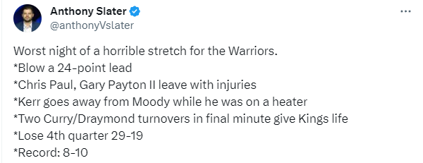 勇士队记Anthony Slater总结勇士遭遇本赛季最黑暗的一个夜晚——惨遭24分逆转,保罗和小佩顿伤退,科尔在穆迪状态火热时将他换下,最后1分钟库里和追梦两个致命失误,末节19-29崩盘,赛季战绩8胜10负(排在西部第10位)