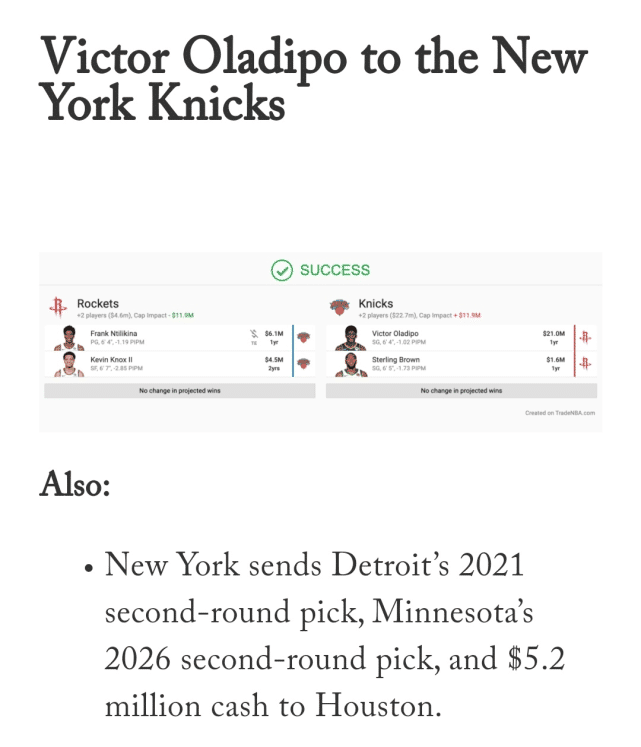 这笔交易的方案是火箭送出奥拉迪波和斯特林-布朗,得到尼克斯的尼利基纳、诺克斯、2021年次轮签(原属于活塞)、2026年次轮签(原属于森林狼)以及520万现金。
