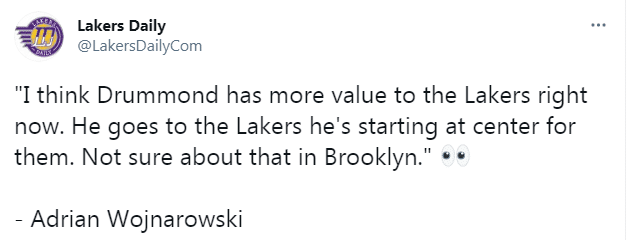 ESPN记者沃纳罗斯基在节目中表示,如果德拉蒙德被骑士买断,他更有可能选择湖人。对于湖人而言,他更有价值。“他加盟湖人,可以成为首发中锋,如果去篮网,就不那么确定了,”沃纳罗斯基谈到庄神的前景时说道。