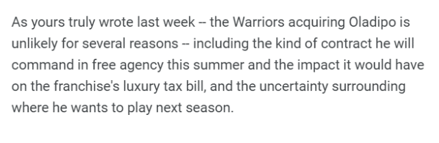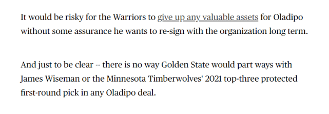 其二,奥拉迪波将在本赛季结束后成为一名自由球员,就算他通过交易来到勇士,也不能确保就能和勇士续约。如果只是租用半个赛季,付出怀斯曼或者森林狼首轮签的代价,就实在太亏了。勇士不得不考虑这一点,毕竟此前报道称,奥拉迪波和热火、尼克斯关系紧密,他很有可能届时选择加盟这两支球队。