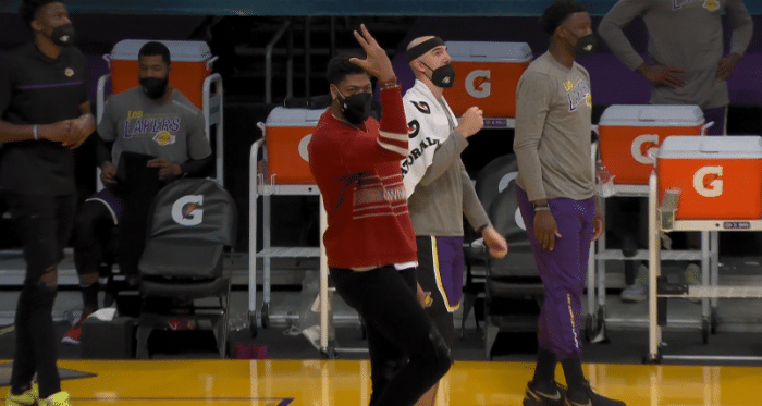 到了第二节,詹姆斯先是接塔克传球空接暴扣,然后又在反击上完成势大力沉的双手砸扣,直接点燃替补席,詹姆斯和库兹马击掌撞胸庆祝,库兹马假装被老詹撞开太有趣,戏精上线;紧接着湖人继续拉开分差,塔克反手上篮,浓眉站在场边模仿小弟,湖人进攻犀利,场边氛围太好。
