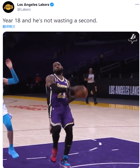 比赛刚开始,詹姆斯外线出手投进三分球,然后在快攻反击中暴扣得分,强突上篮以及造犯规,外线三分出手再有,首节仅打8分钟便轰下13分;对于詹姆斯的双手暴扣,湖人官方发推写道:第18个赛季,詹姆斯没有浪费任何一点时间。