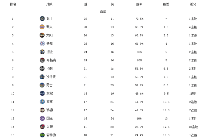 勇士昨天赢球之后避免连败,他们距离前八之间有1个胜差。灰熊的战绩是18胜19负。雷霆输给老鹰,他们被对手拿下了7连胜,自己吃到2连败。鹈鹕今天对阵利拉德的开拓者,他们一度有机会实现逆转,可惜还是遗憾输了球。国王战绩是16胜24负,想要冲击季后赛,还需要努力。火箭已经吃到了18连败,创造队史最长连败纪录。森林狼依靠着末节的爆发爆冷击败太阳。