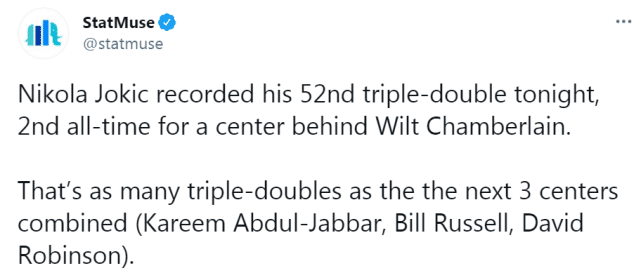 其一,约基奇拿下生涯第52次三双,在中锋历史上仅次于张伯伦(78次)。他的52次三双,和位列第三至五位的三位中锋的三双总和一样多。贾巴尔(21次)、拉塞尔(17次)、大卫-罗宾逊(14次),三人相加正好是52次。