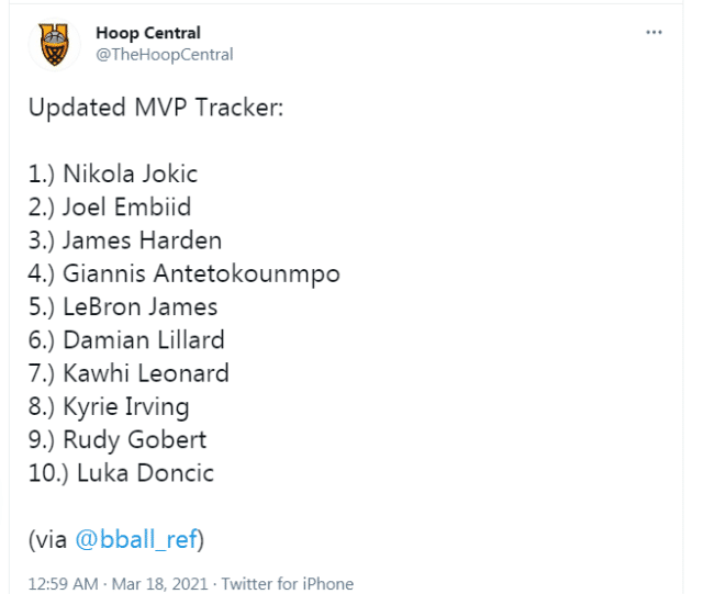 数据网站Basketball-Reference根据往年投票结果的模型,更新了本赛季常规赛MVP的当选概率,目前,约基奇以40.6%的当选概率位居榜首。排名第二至五位的依次是恩比德、哈登、字母哥和詹姆斯。
