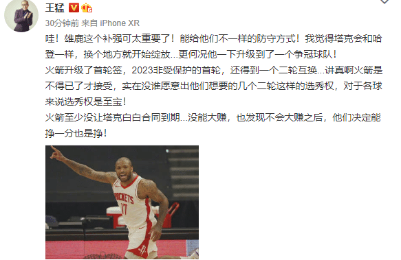 很快知名篮球人王猛发文表示:哇!雄鹿这个补强可太重要了!能给他们不一样的防守方式!我觉得塔克会和哈登一样,换个地方就开始绽放...更何况他一下升级到了一个争冠球队!火箭升级了首轮签,2023非受保护的首轮,还得到一个二轮互换...讲真啊火箭是不得已了才接受,实在没谁愿意出他们想要的几个二轮这样的选秀权,对于各球来说选秀权是至宝!火箭至少没让塔克白白合同到期...没能大赚,也发现不会大赚之后,他们决定能挣一分也是挣!