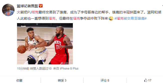贾磊表示:火箭把PJ塔克最终交易到了雄鹿,成为了字母哥身边的帮手,雄鹿的冲冠拼图来了。篮网和湖人此前也一直想得到塔克,但最终在塔克争夺战中败下阵来