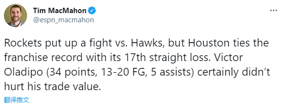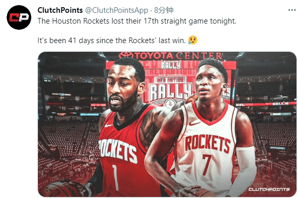 火箭17连败引热议,名记麦克马洪发推写道火箭17连败,但没有影响奥拉迪波的交易价值;奥拉迪波尽力了,个人表现还是很不错的;美媒Clutch Points发推写道火箭已经41天没赢球;火箭下一场将在丰田中心迎战勇士,主教练赛拉斯宣布奥拉迪波轮休不打,沃尔继续伤停,火箭残阵很有可能不敌勇士惨遭队史最长18连败。