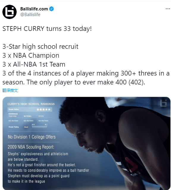 美媒Bakkislife.com发推列出一系列和3有关的数据——3星高中生、3次总冠军、3次最佳一阵、生涯3次单赛季至少命中300记三分,史上只有他单赛季命中400+三分(402记三分)